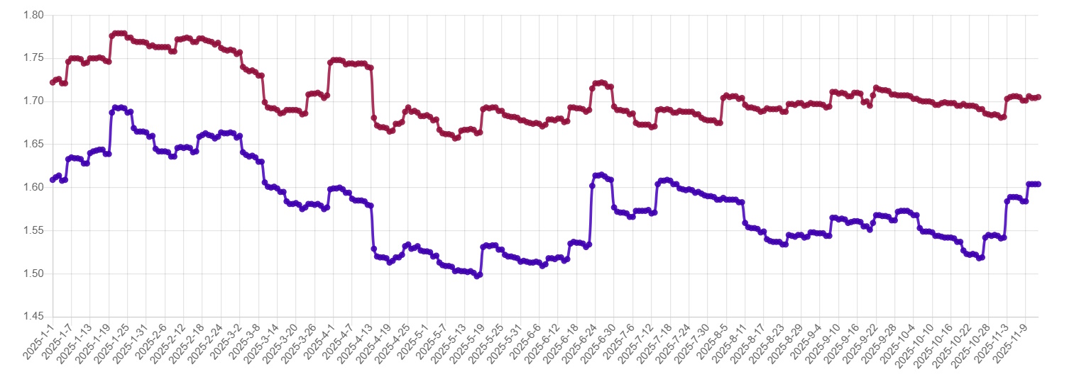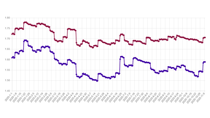 Veja abaixo o quadro da DGEG que apresenta a evolução dos preços dos combustíveis, desde o dia 1 de janeiro de 2025. A vermelho surgem os preços da gasolina e a azul do gasóleo.