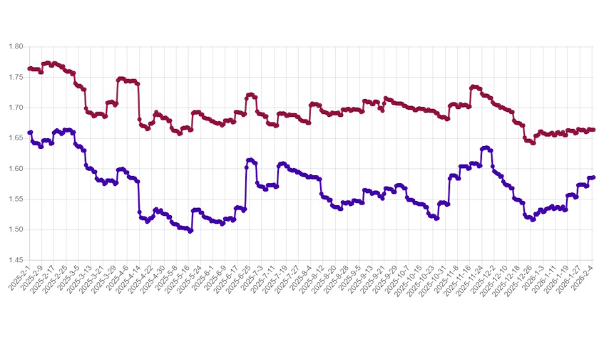 Veja abaixo o quadro da DGEG que apresenta a evolução dos preços dos combustíveis, desde o dia 1 de fevereiro de 2025. A vermelho surgem os preços da gasolina e a azul do gasóleo.