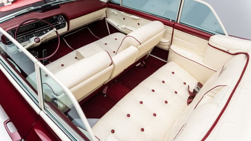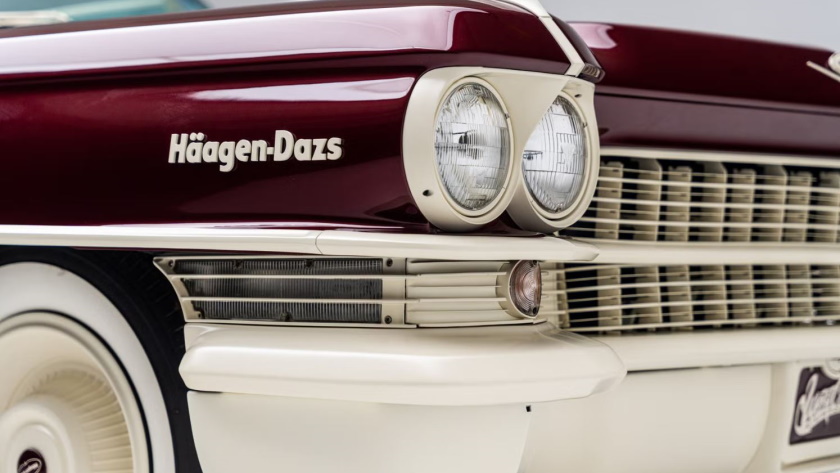 Este Cadillac Serie 62, de 1963, exibe as cores bordeaux e creme, marcas registadas da Häagen-Dazs, tanto no exterior como no interior, e todos os seus cromados deram lugar a um tom creme mate. O clássico conta, ainda, com o logotipo daquela marca de gelados. Outro detalhe curioso vai para o espaço projetado para acomodar dois cones de gelado, além de um suporte especial que se estende do apoio de braço central dianteiro.
