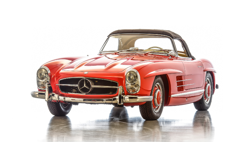 Já do outro extremo da linha de produção surge um Mercedes-Benz 300 SL Roadster de 1962 (estimativa: 1.200.000 € – 1.500.000 €), um dos últimos exemplares fabricados em Sindelfingen. Um dos apenas 182 Roadsters produzidos nesse ano, foi entregue novo no Reino Unido na cor vermelho vivo (“Fire Engine Red”) com interior creme combinação que mantém até hoje. Restaurado entre 2015 e 2016 pela Mercedes-Benz Classic, este exemplar “matching numbers” é acompanhado pelo livro oficial de restauro e pela ficha de dados de fábrica.