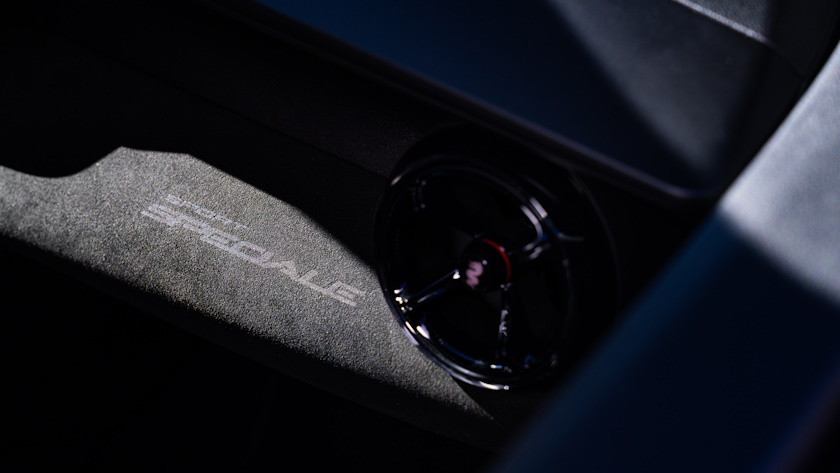 No interior, o destaque vai para o revestimento em Alcantara perfurada, com detalhes em tom “gelo” e costuras contrastantes.